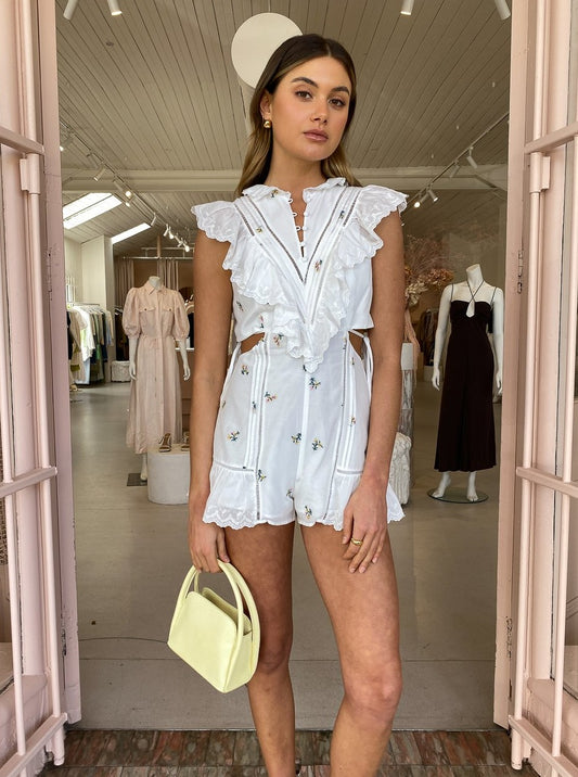 The charming and whimsical detail of the Saint Armont Luster Cut Out Playsuit in White Xyris transports us to fairytale like moments.