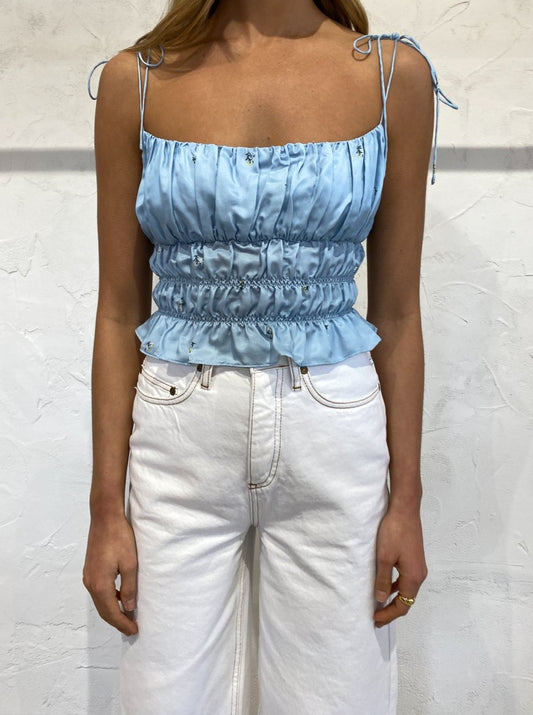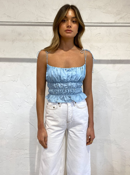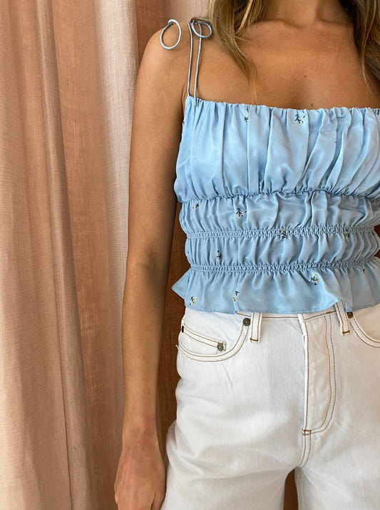 Saint Armont are adding a sophisticated touch to our Coco crop closet in the ever romantic and nostalgic Xyris Smocked Cami in Cornflower Xyris.