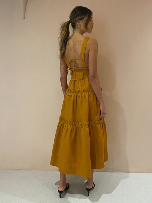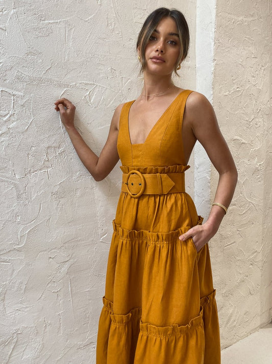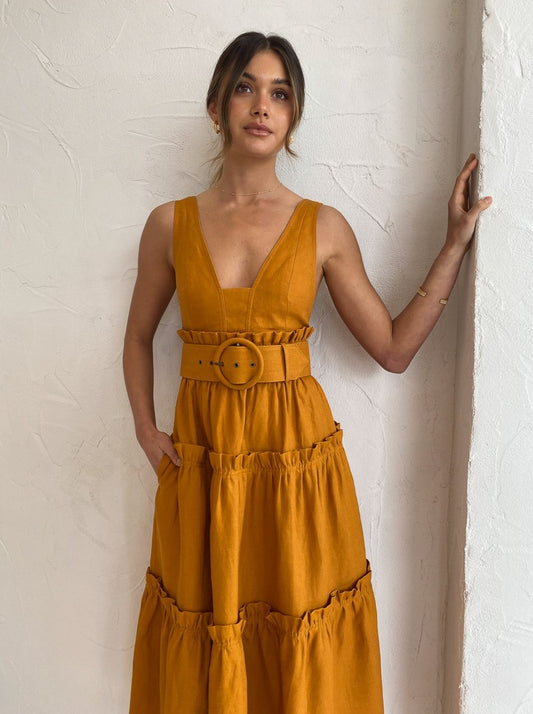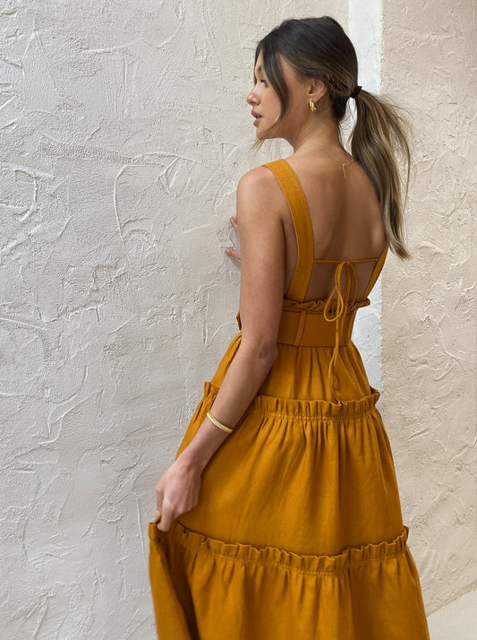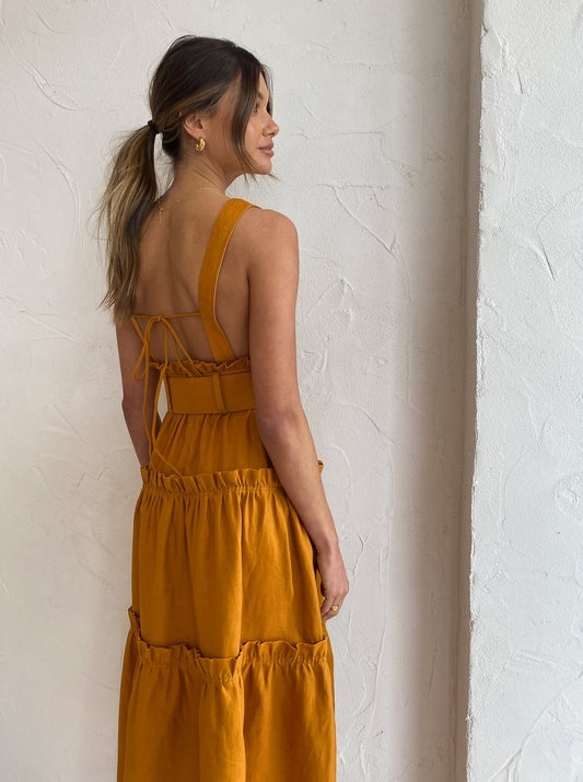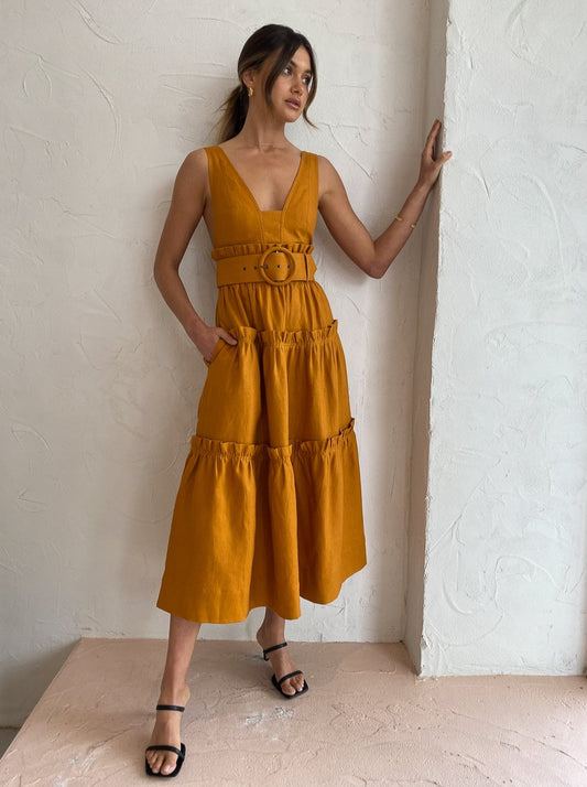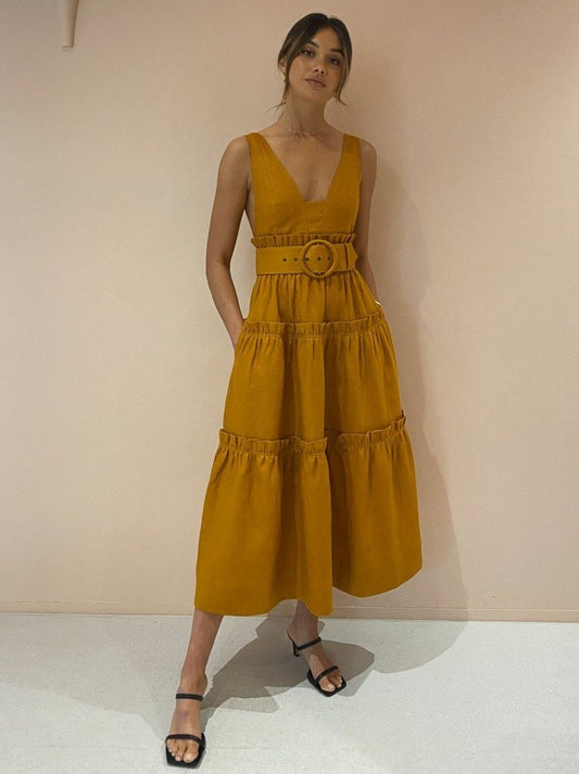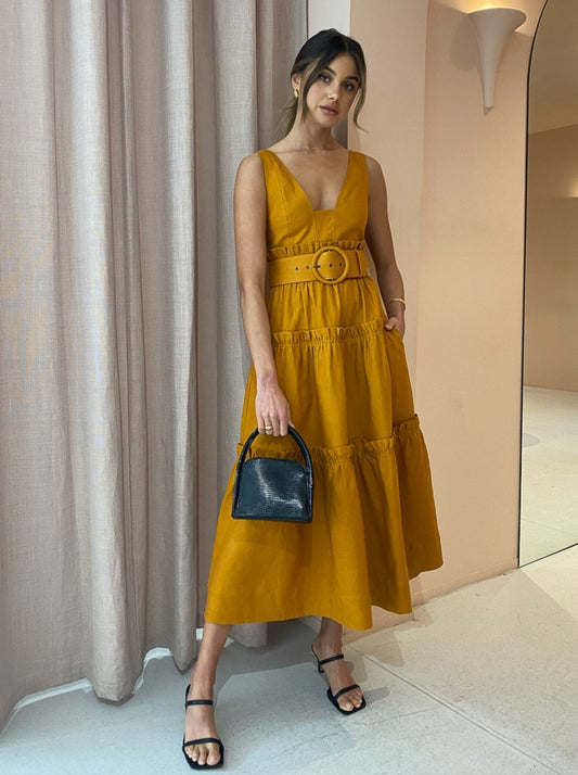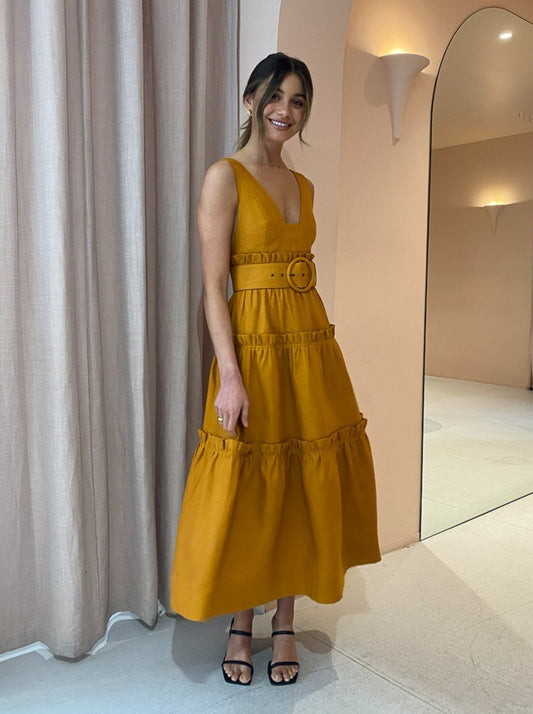 Shona Joy has us loving feminine structured silhouettes in a nature inspired hue with the Aria Tiered Midi Dress in Turmeric.