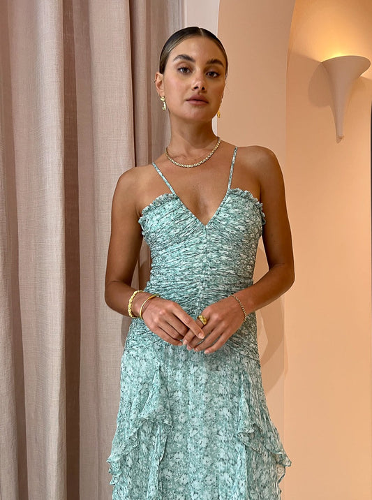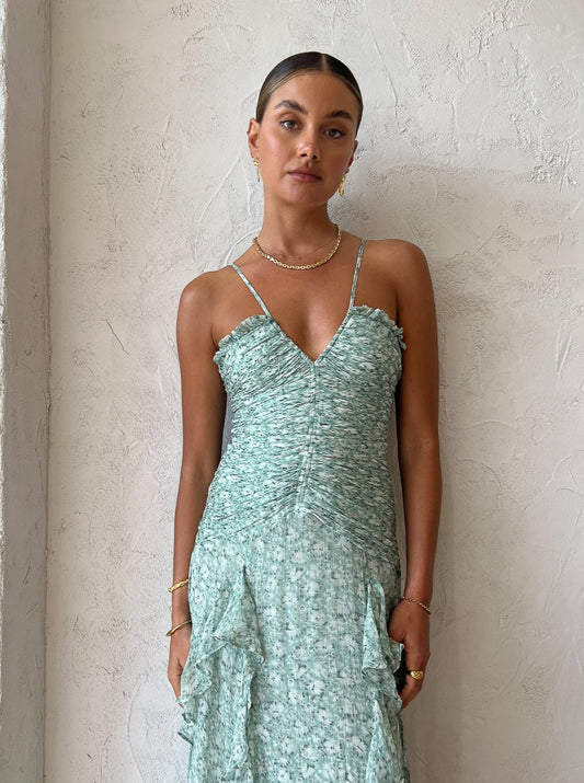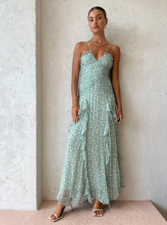 Float gracefully through life's romantic moments with the Shona Joy Aurore Frill Maxi Dress in Thyme/Mutli.