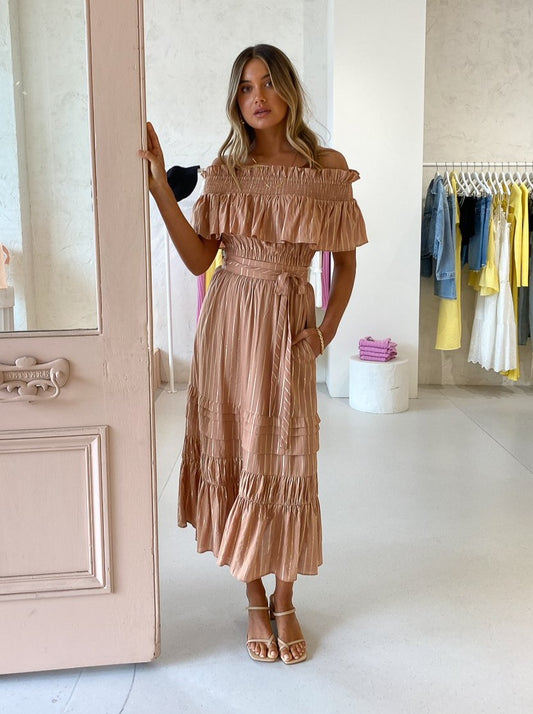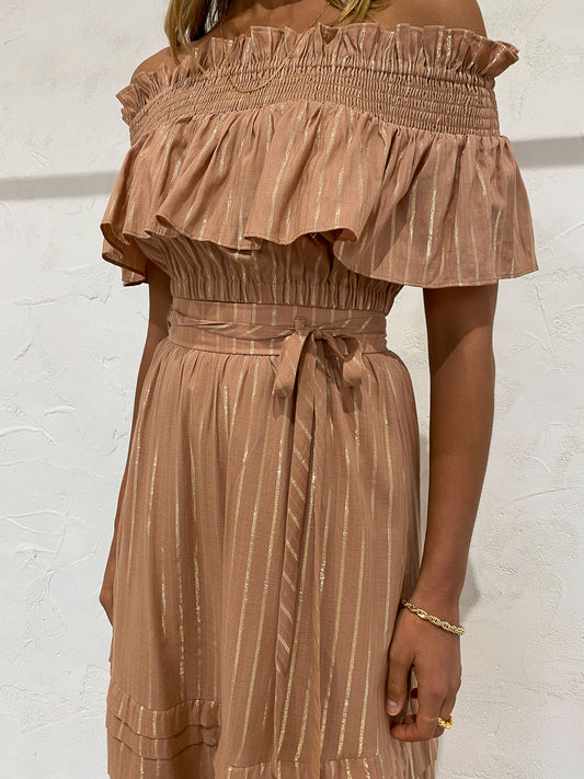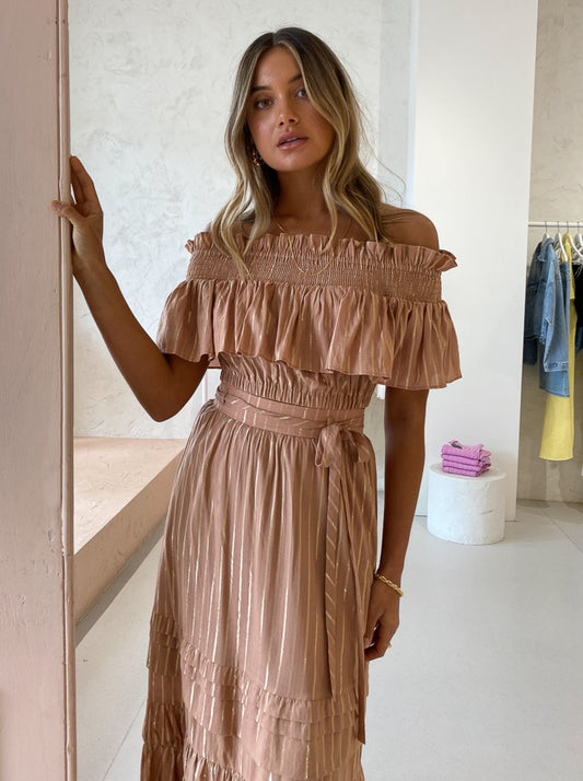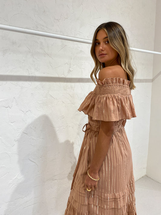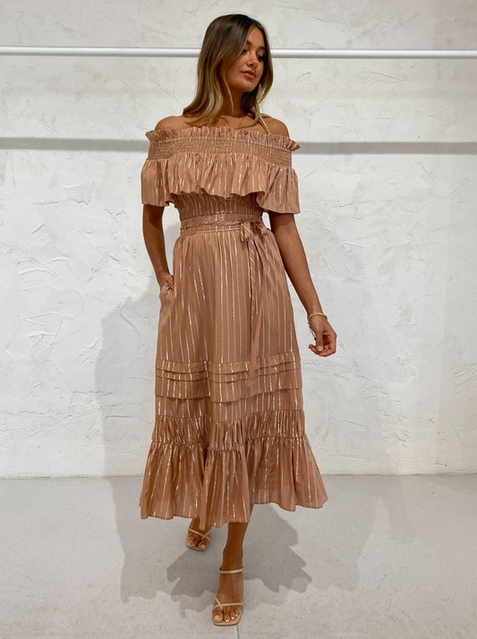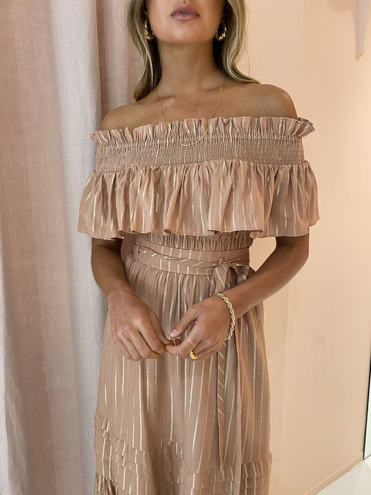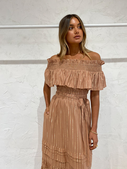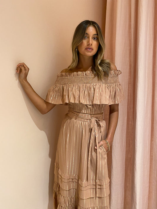 The Shona Joy Corinne Shirred off the shoulder Crop in Desert Rose showcases a rich sunset rose tone with accents of gold metallic lurex throughout.
