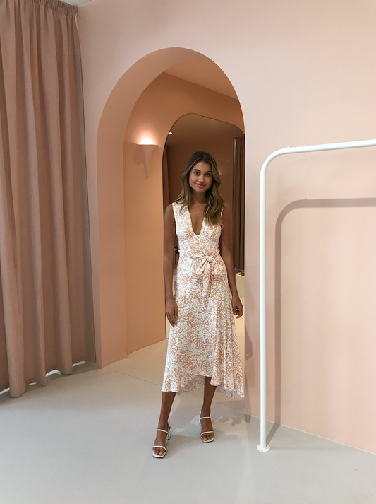 The Shona Joy Heather Plunged Midi dress in is perfect for your next smart casual event. This peach hued midi dress is great for Spring/Summer weddings, Christenings, Baby Showers or even Christmas lunch.