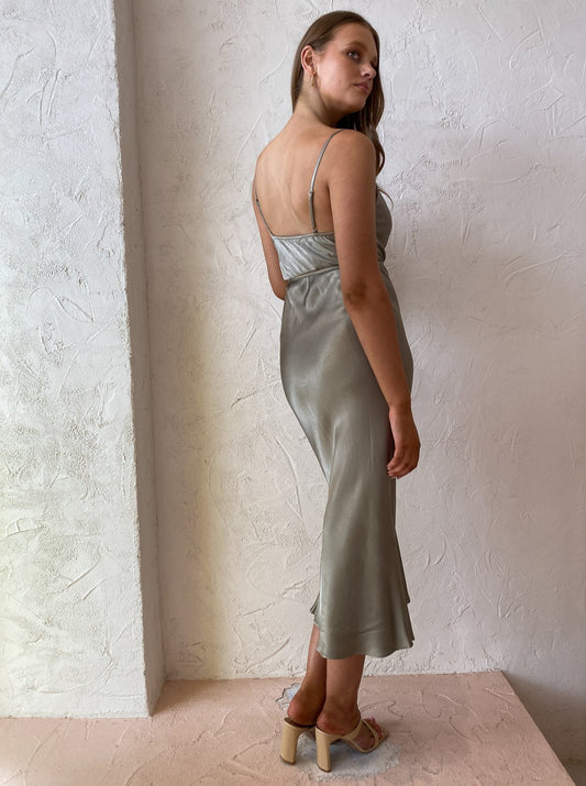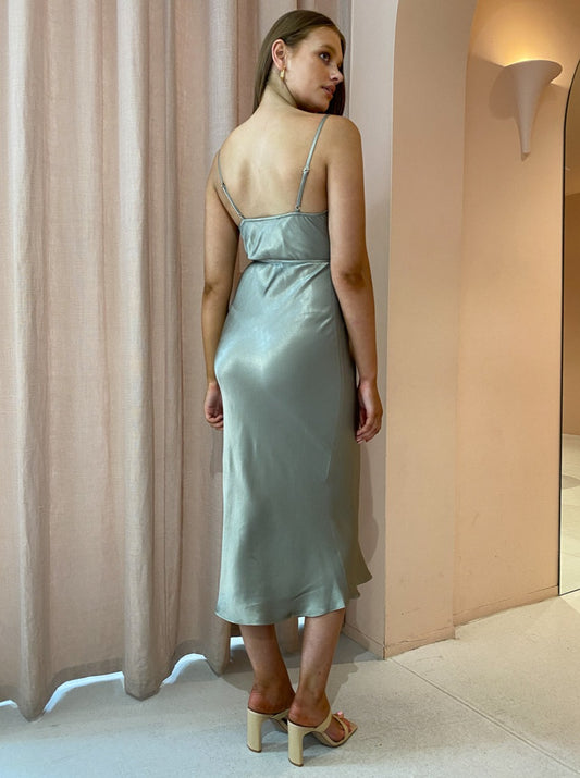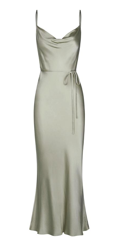 Adored for its luxurious sheen fabrication in a stunning sage hue, the La Lune will become your go-to midi for wedding festivities, twilight cocktails and formal soirees.