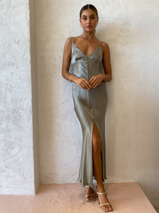The La Lune Bias Slip Dress in Sage from Shona Joy adds a timeless hue to our occasion styling repertoire.