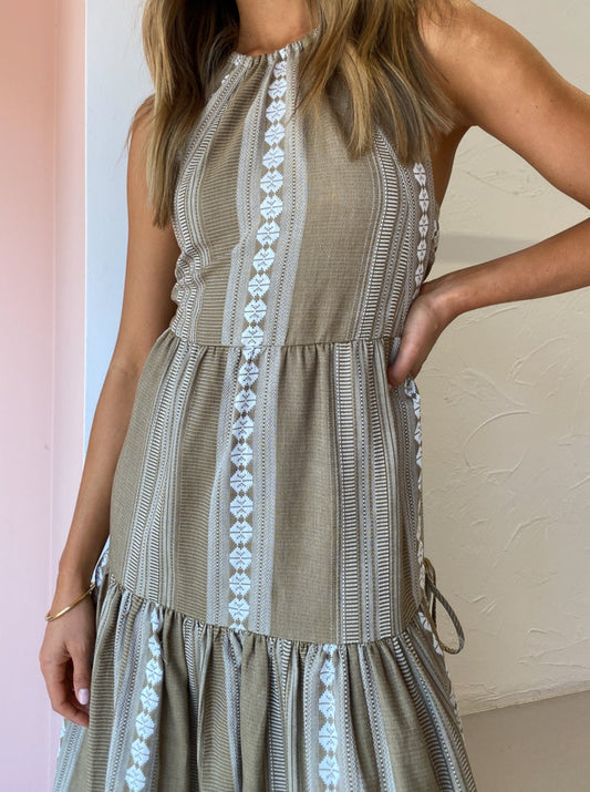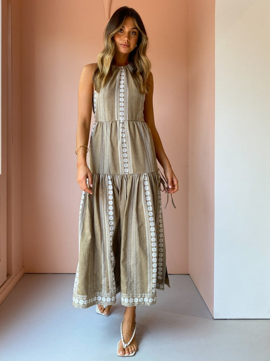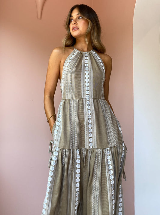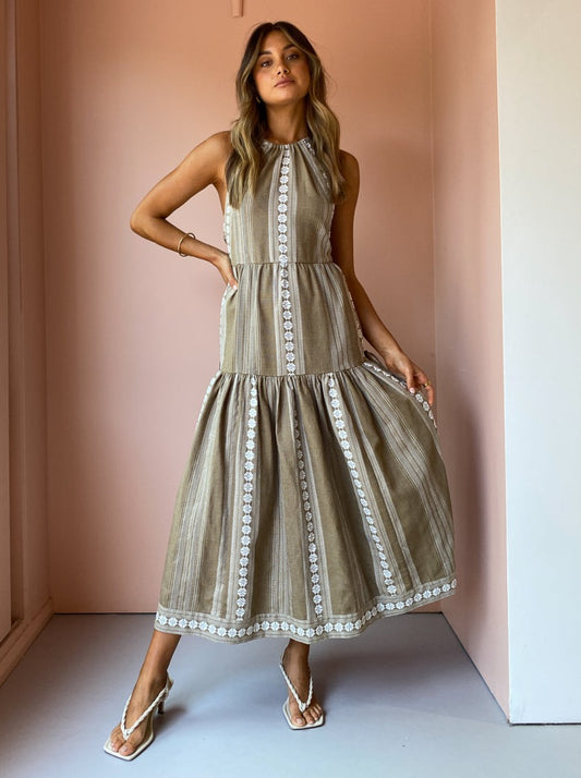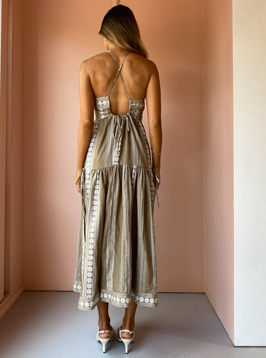 The nostaglic vintage charm of Shona Joy's Lizete Backless Halter Midi Dress in Cumin/Ivory inspires wanderlust for countryside escapes and winery tour getaways.