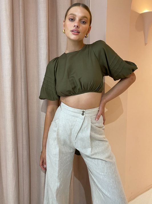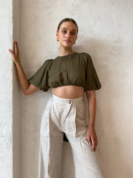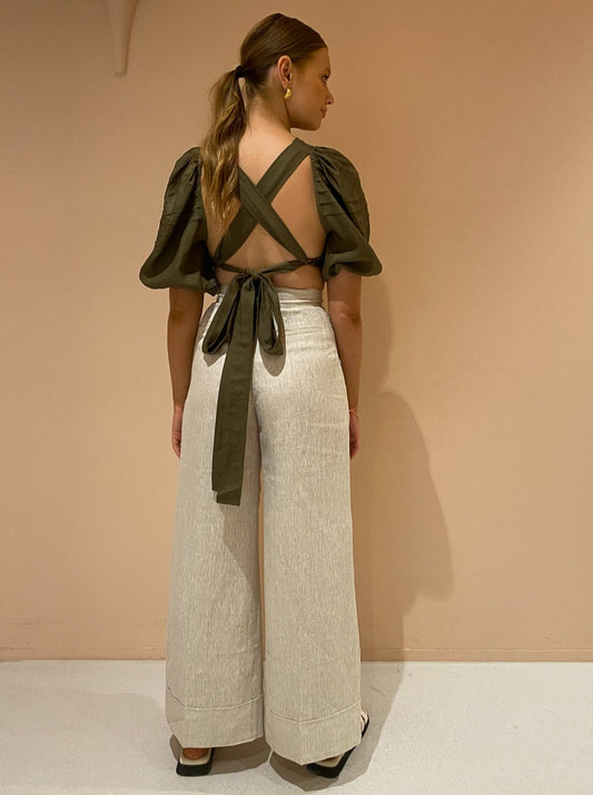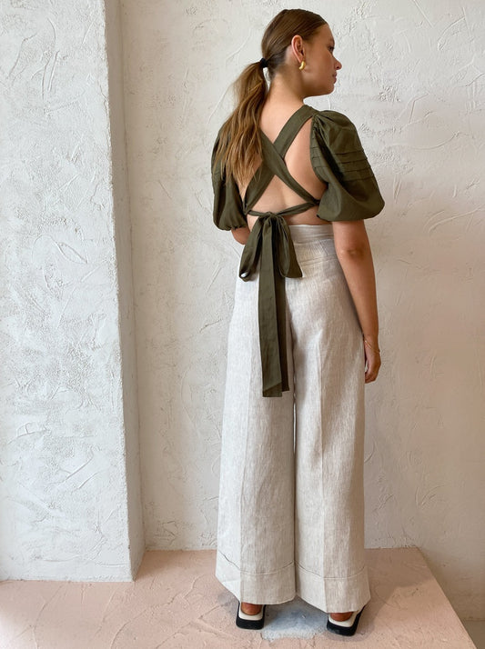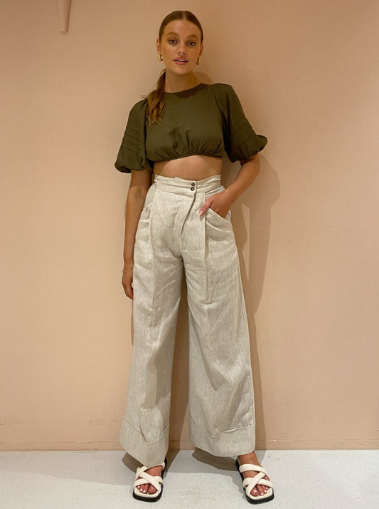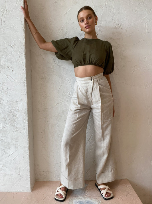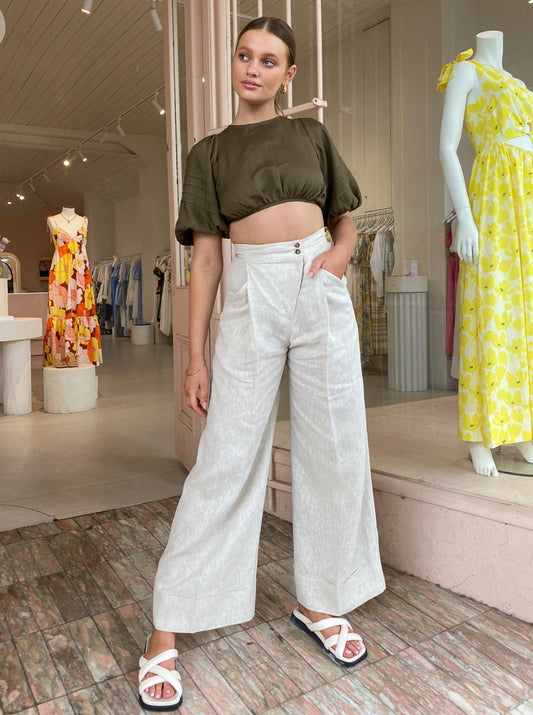 Luxuriously crafted from a medium weight, semi sheer Linen in Natural. High waisted and cut with a flattering wide leg silhouette, they feature a two button fly closure and two functional front side pockets.