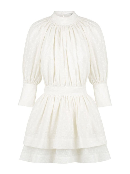 Expect to turn heads in this statement mini dress, cut in a soft Cotton Broderie Anglaise with a high neckline, voluminous ¾ length sleeves with wide cuffs, gathering at the neck and waistline and a sweet tiered hem.