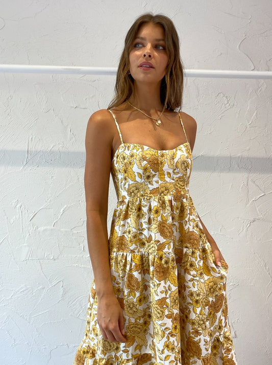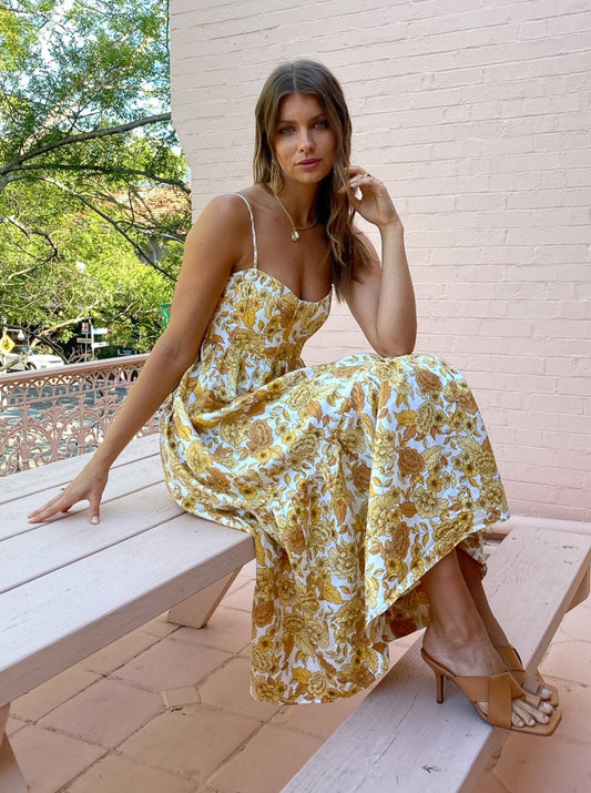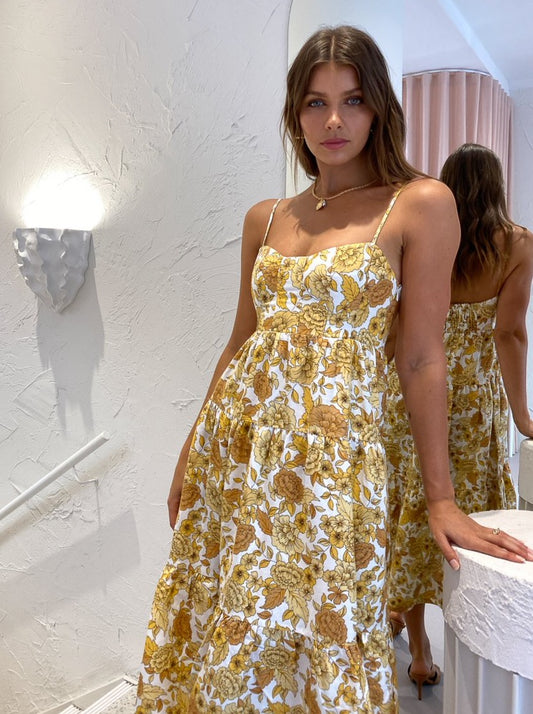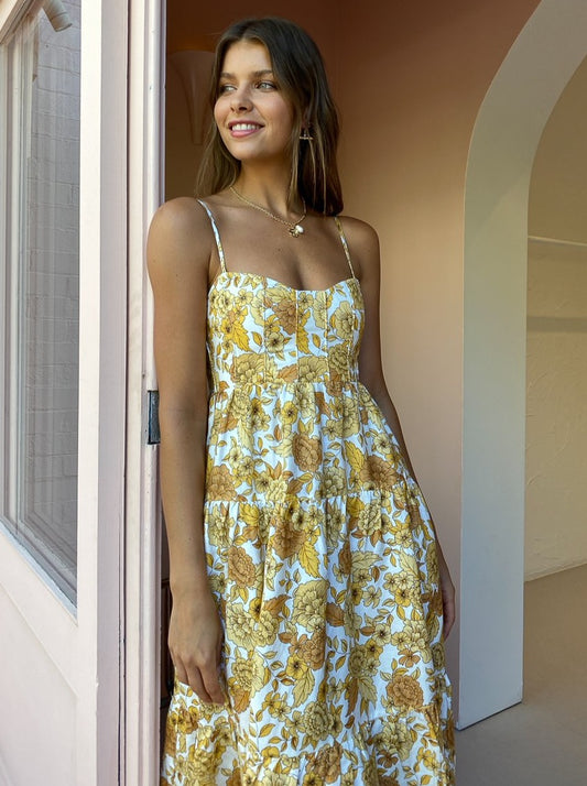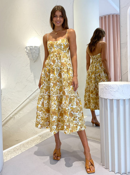 The Shona Joy Margarita Tiered Midi Dress in Sunflower is the perfect printed piece to to add to your summer holiday wardrobe.