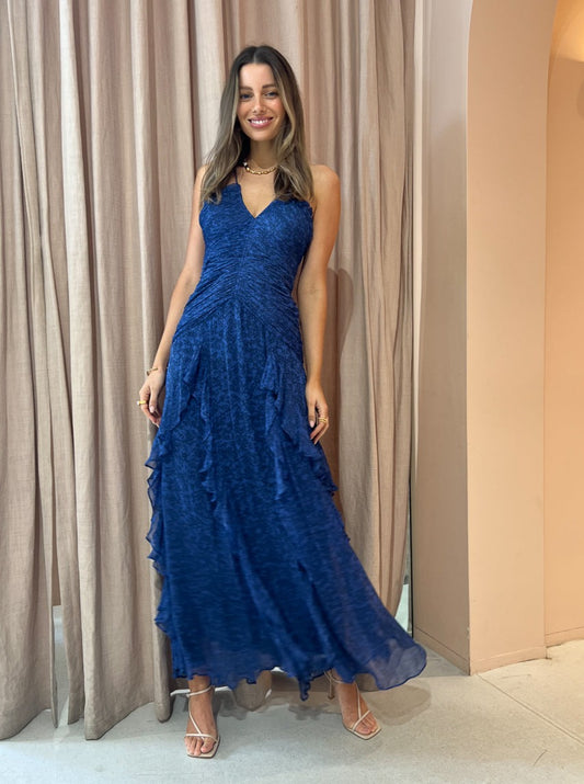 Shona Joy Saldanha Ruched Frill Maxi Dress in Strong Blue/Deep Blue