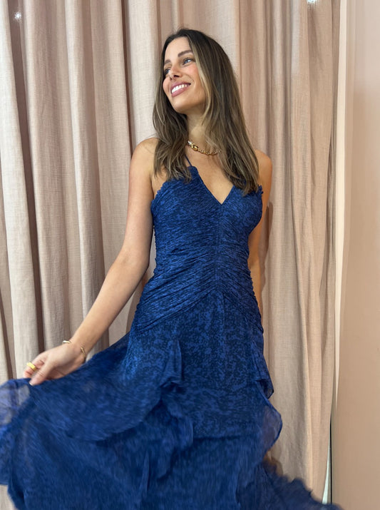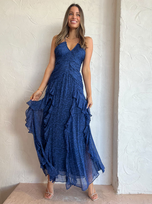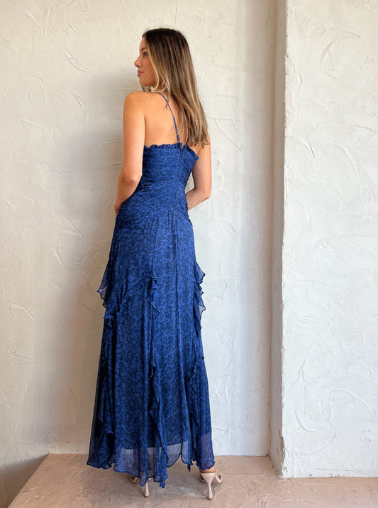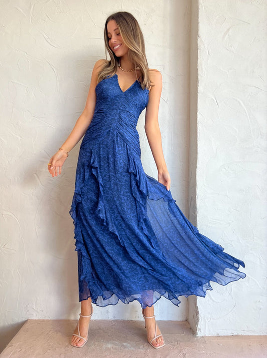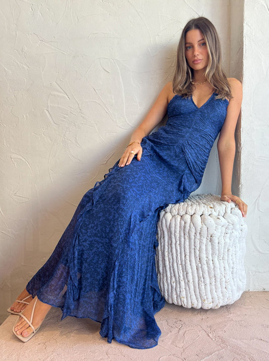 Make a statement in the Shona Joy Saldanha Ruched Frill Maxi Dress in Strong Blue/Deep Blue by Shona Joy.