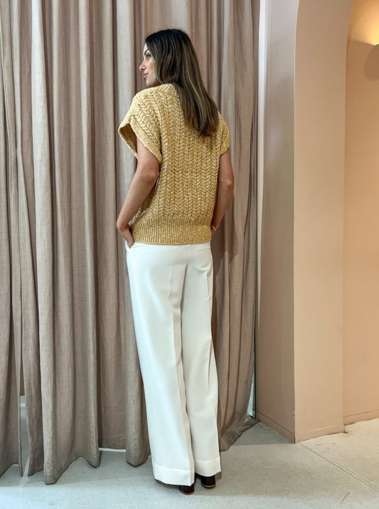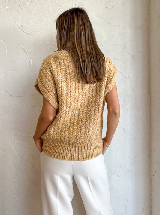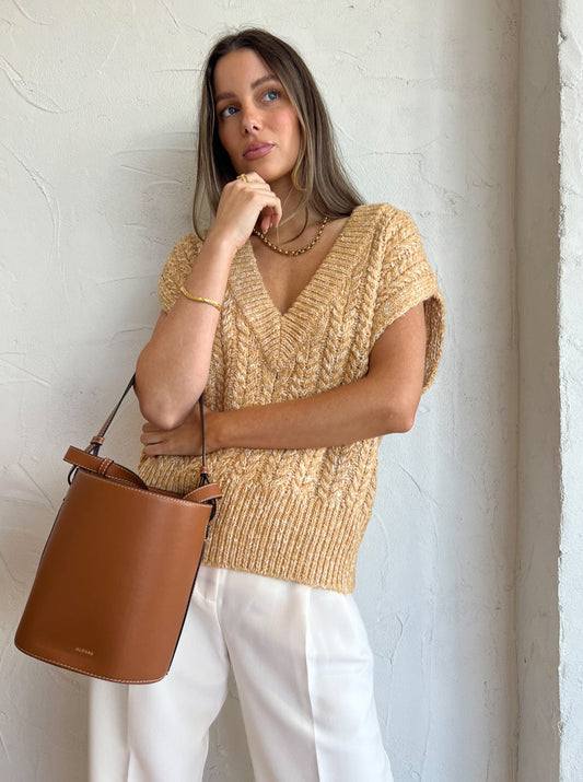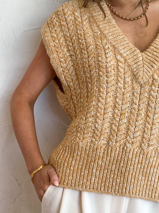 Crafted from a soft cotton blend cable knit, this vest features a V-neckline and chunky ribbing at the hem and neckline, creating a timelessly elegant silhouette.
