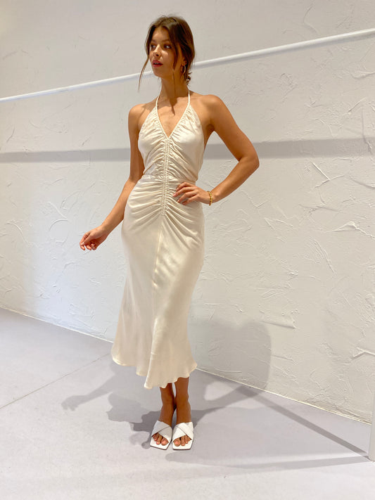 Shona Joy Sophia Halter Ruched Midi Dress in Cream