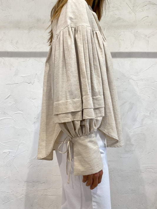 Cut from a luxurious Cotton Linen blend this relaxed fit blouse featuring dramatic balloon sleeves with pleat detailing and wide cuffs, celebrating raw femininity through voluminous styling.