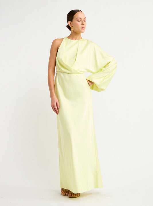 This luxurious midi dress features an asymmetrical one-shoulder cut, draped sleeve, and a high neckline for a truly statement look. With its bias cut and invisible back zip, the stunning Citron-hued dress is both flattering and comfortable.