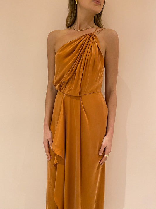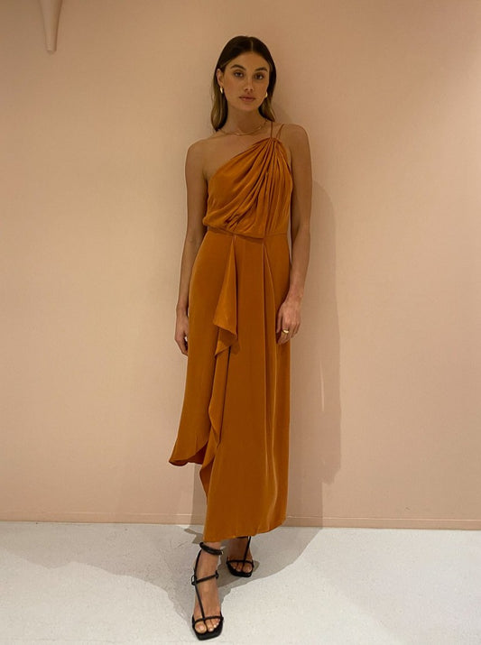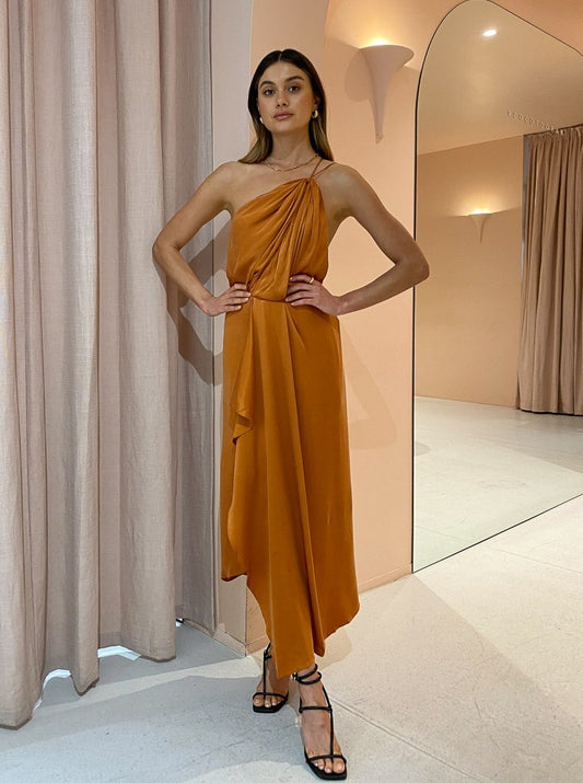 Fitted at the at the bodice and falling softly into a draped midi length hemline with a centre split, the Athena Dress is crafted by a silky Cupro blend in a rich Caramel hue.