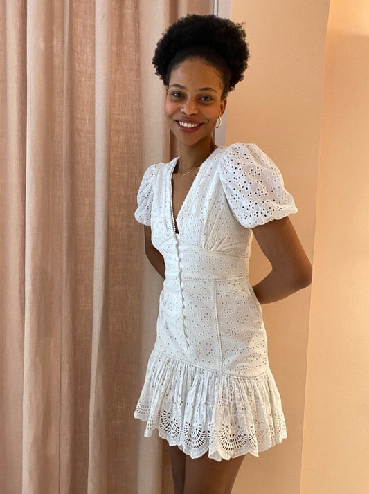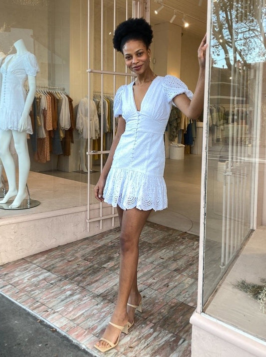 Cut from a gorgeous textured Cotton broderie anglaise, this mini dress with a plunging neckline and perfectly puffed sleeves will add just the right amount of romance to any Coco closet.