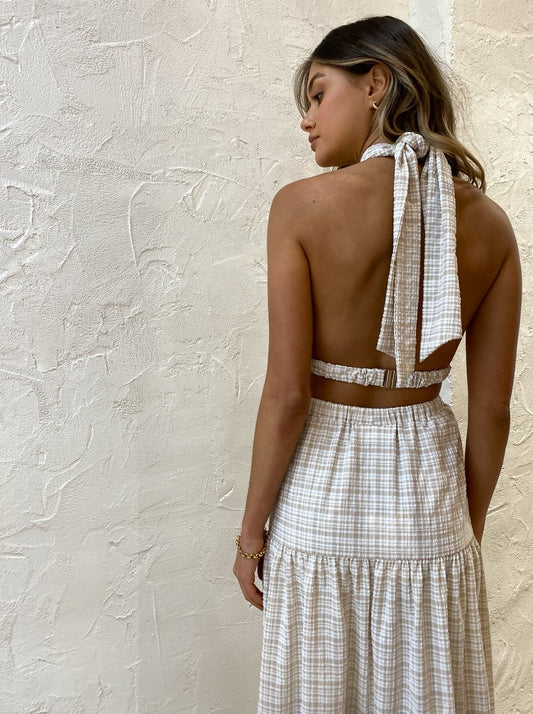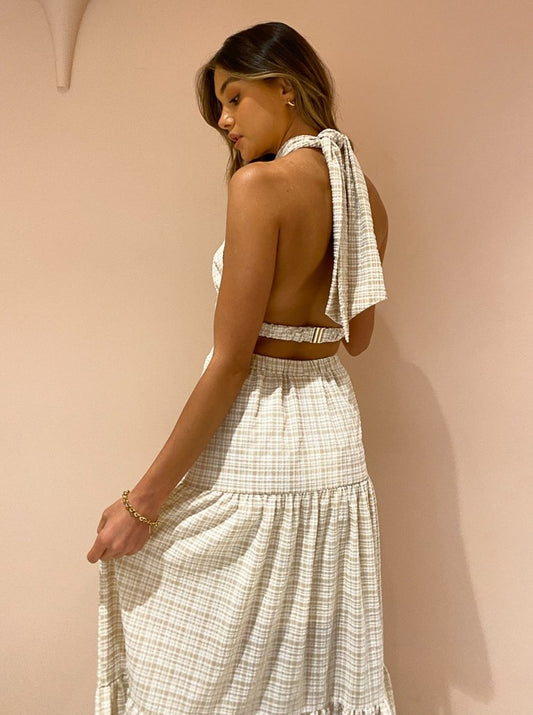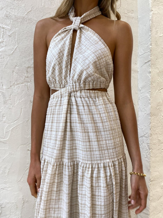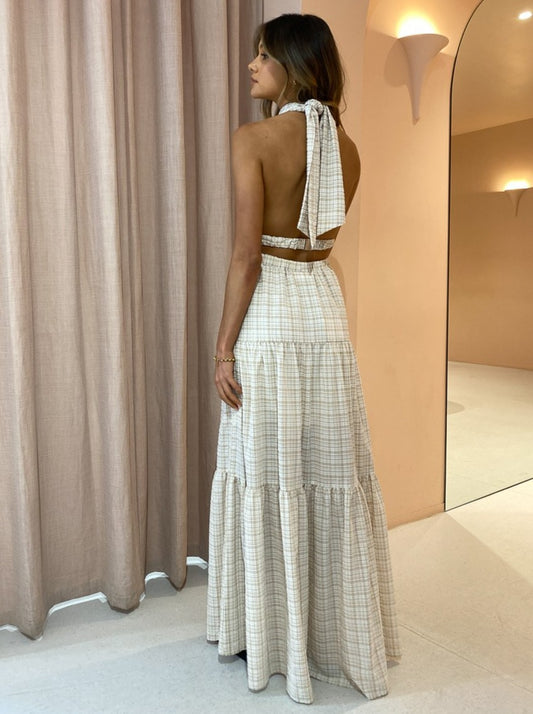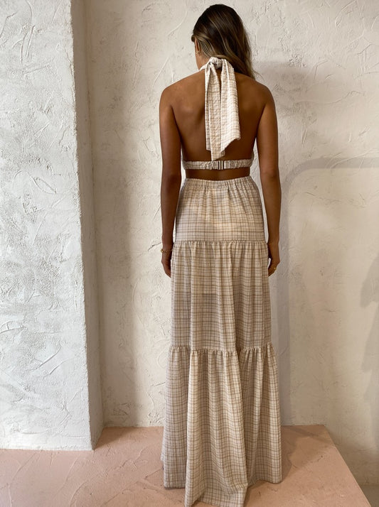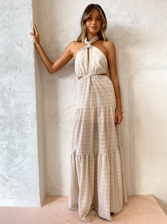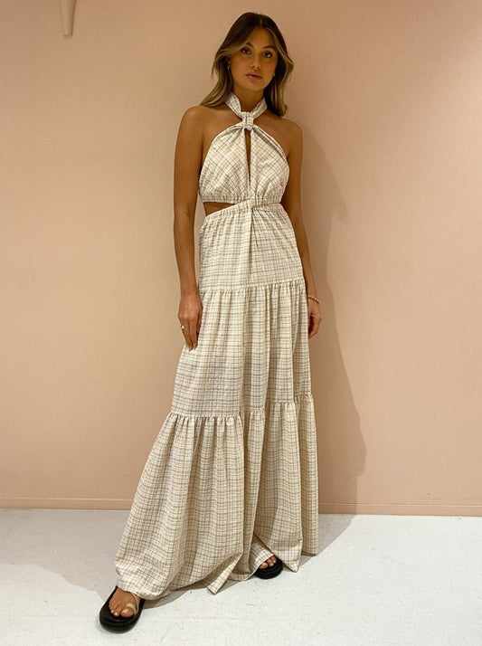 Crafted from a lightweight fabrication in a timeless check print, this maxi dress features a halter neckline and cut out detail at the waist which falls elegantly into a tiered maxi hemline.