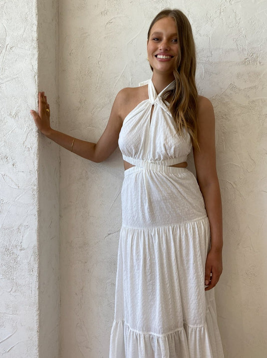 Crafted from a lightweight fabrication in a timeless cream check, this maxi dress features a halter neckline and cut out detail at the waist which falls elegantly into a tiered maxi hemline.