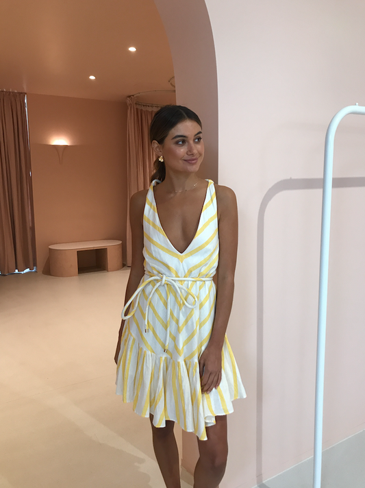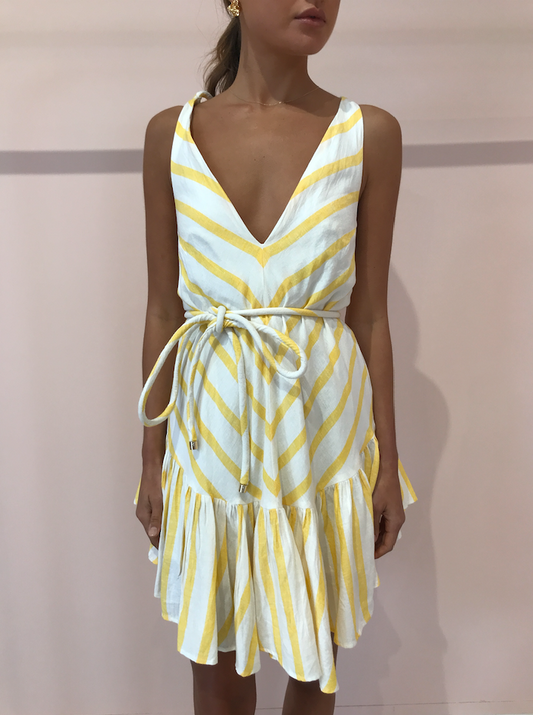 The Significant Other Illusion Dress in linen blend stripe fabrication is a fun and feminine mini dress. This dress features cross-over straps and a low v-neckline.