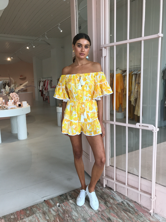 The Significant Other Isla Romper is an off-the shoulder playsuit with frill and gathering detail, front tassel tie and is fully lined.