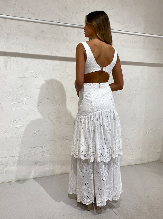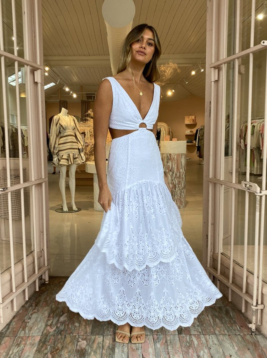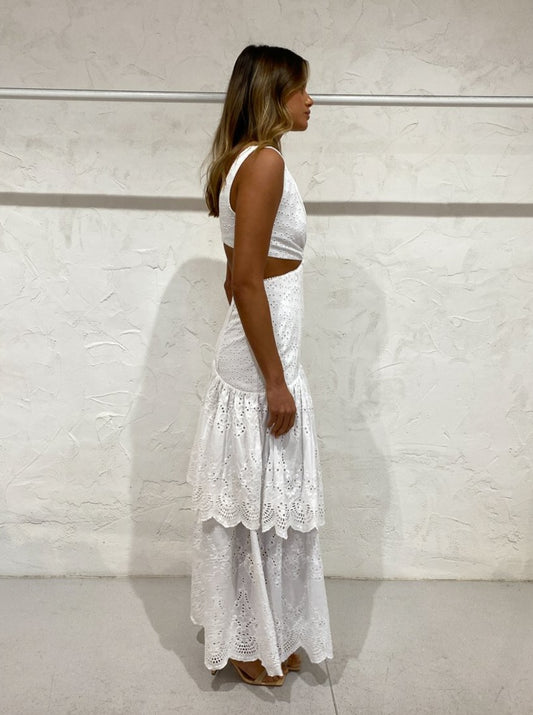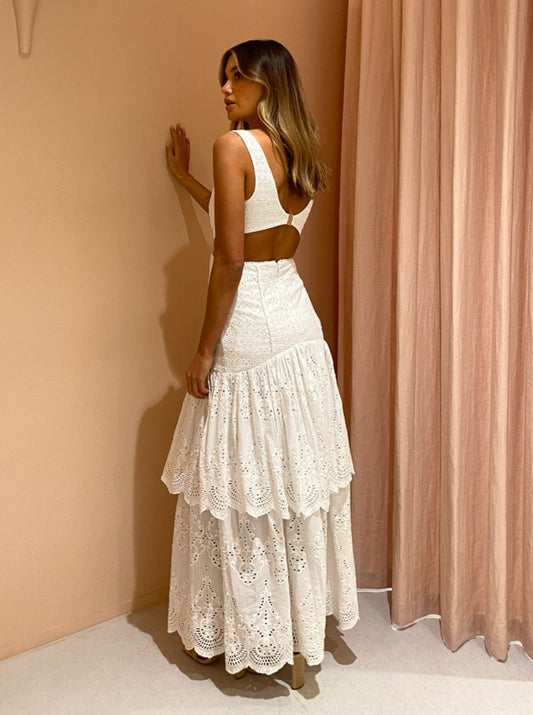 Cut from a gorgeous textured Cotton broderie anglaise, this maxi dress with tiered hemline and cutout detailing ticks all the right boxes for the perfect Coco occasion dress.