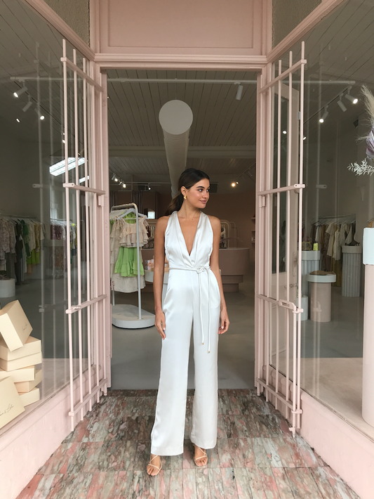 The Significant Other Lucine pantsuit is a wide leg fit with exaggerated v-neckline and statement crossover detail at back.
