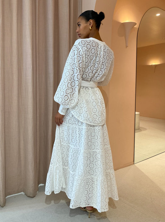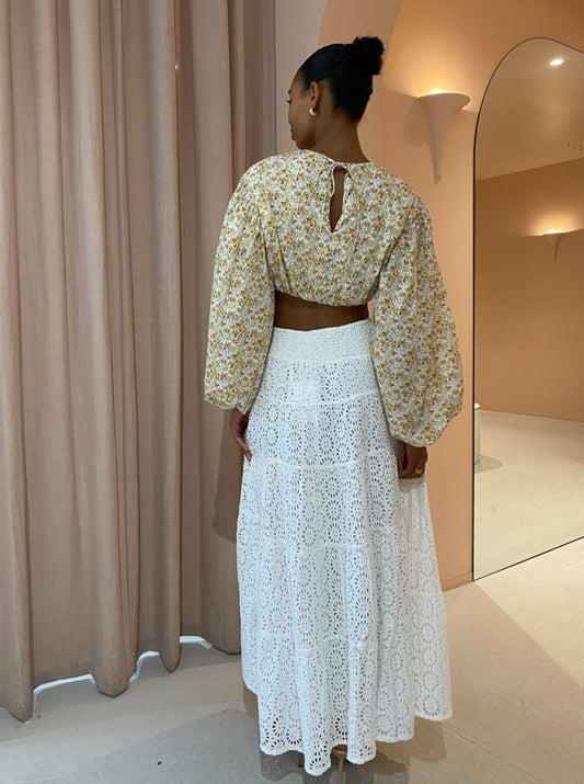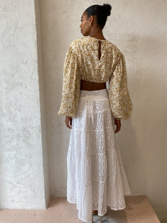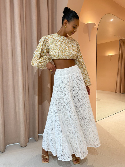 Crafted from a Cotton broderie anglaise fabrication, this maxi skirt sits high on the waist with a shirred waistband before falling into a tiered hemline.
