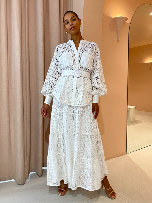 Adored for its textured fabrication and easy to wear silhouette in a timeless Ivory hue, the Mazie skirt will be the perfect paring for long lunches and garden party soirees.
