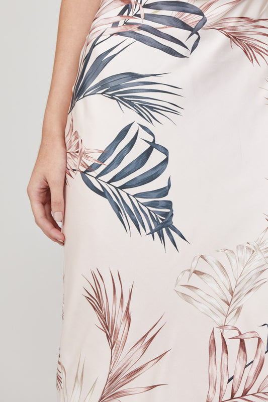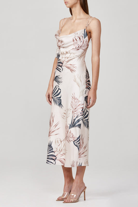 This classic slip dress features a cowl neckline, fine cami straps that create a racer back and is cut on the bias for a flattering fit. The standout of this slip dress is the exclusive palm print in a combination of sorbet hues...