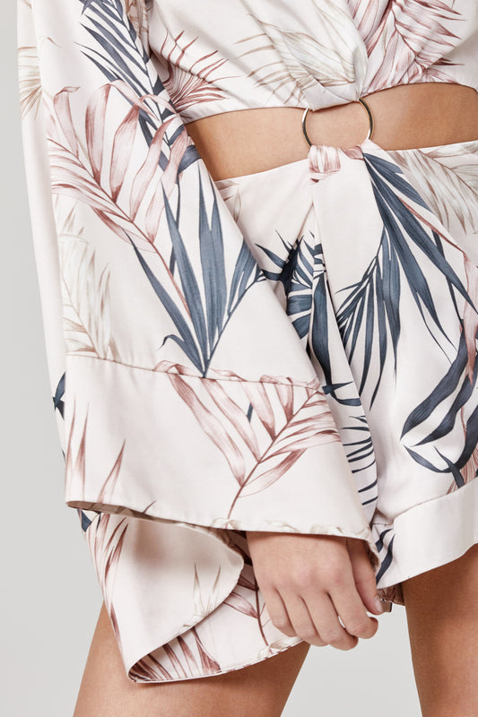 The 'Nowhere' playsuit is the perfect summer party playsuit. Featuring a cut-out sides, round neckline with bell sleeves and is cut from the most beautiful palm print fabric.