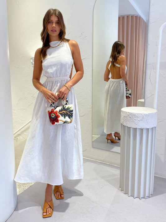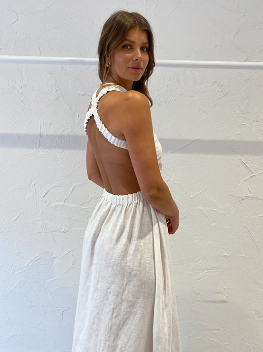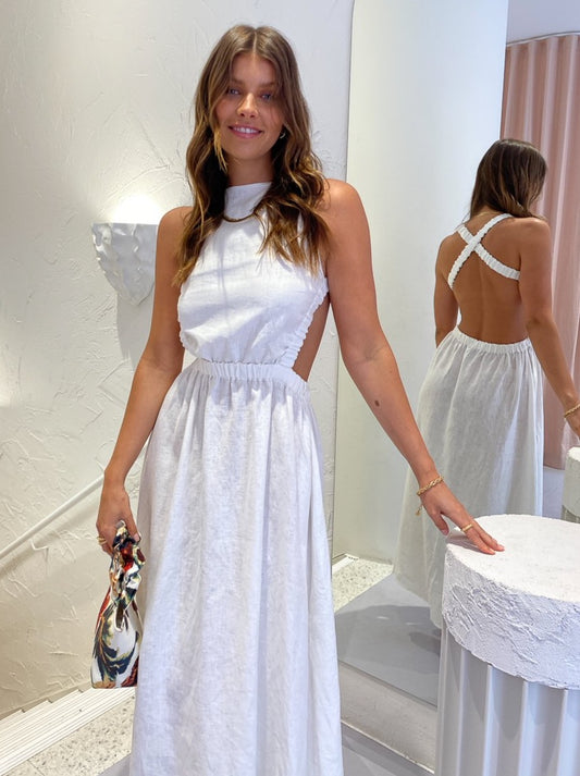 Designed and crafted from 100% Linen this maxi dress features an open back with wide elasticated cross straps. We love how this piece can take you from day to night with the simple change of a shoe.