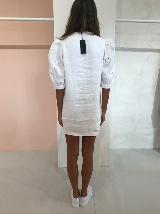 The SIR Alena Mini Dress in Ivory is a boxy linen mini dress with embroidered puff sleeves and a corded neck tie.