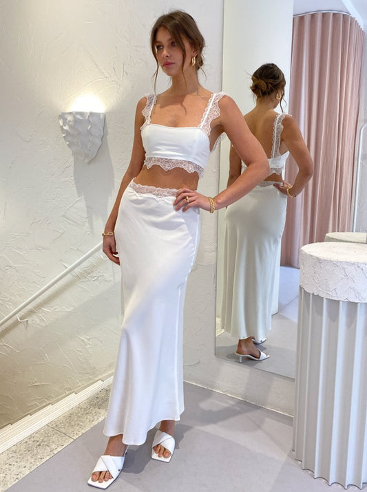 The SIR Alma Midi Skirt in Ivory is crafted from the softest silk and Italian lace.