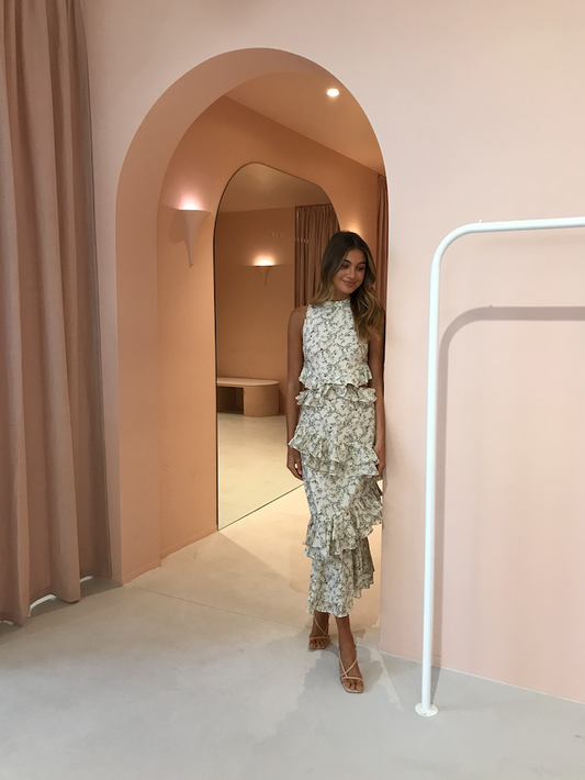 The SIR Annalie Ruffle midi dress is standard in size. Our model wears a size AU8/Size 1 and is 179cm.