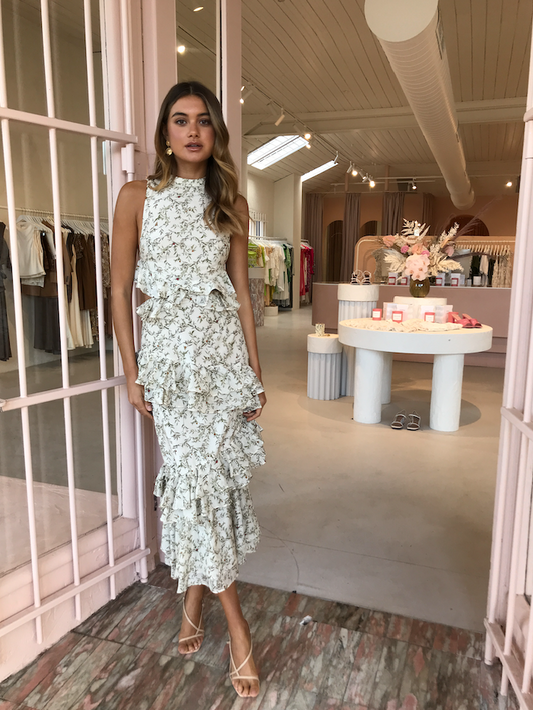 The SIR Annalie Ruffle midi is perfect for that upcoming Wedding. Style with gold accessories and nude Alias Mae heels for a smart-casual look.