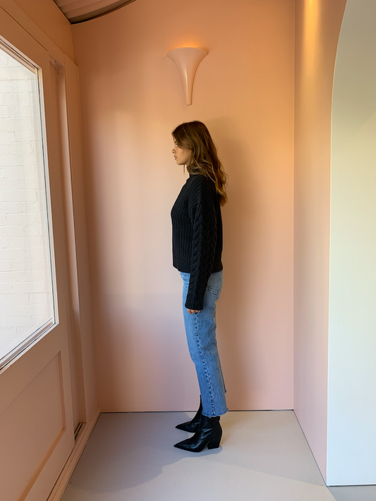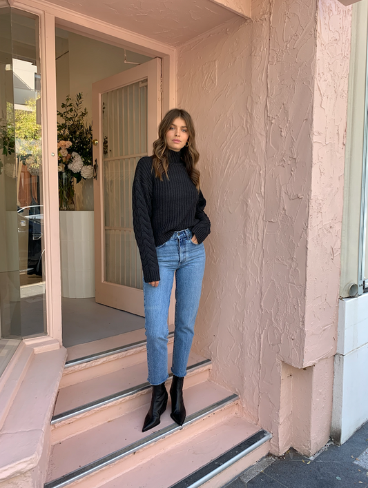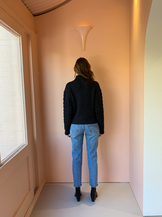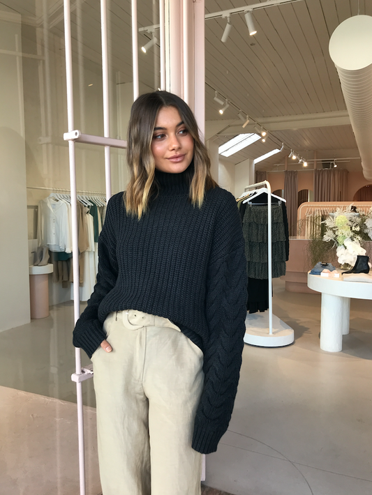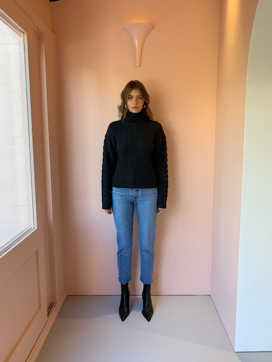 The SIR Ava High Neck knit is a cotton wool blend ribbed sweater featuring contrast cable knit sleeves and a high turtle neck.