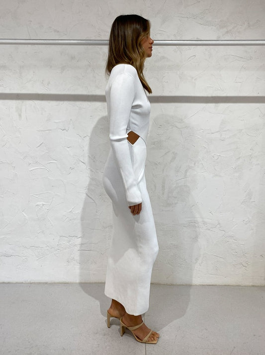Designed to shape the femme form in all the right ways, this ivory midi length long sleeve dress is crafted from a ribbed viscose blend with stretch for comfort.