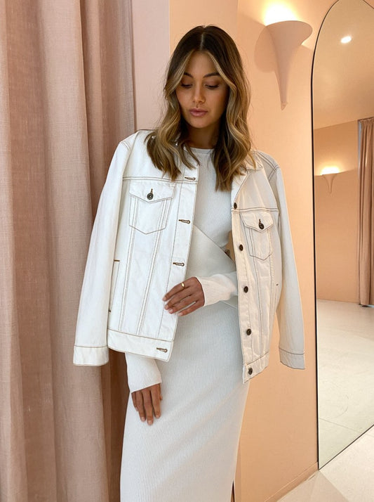 For those cooler days, layer over the SIR. Denim Jacket in Ivory Denim for a chic Coco edge.