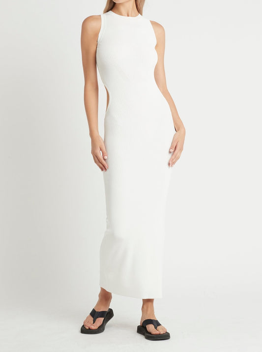 This midi is crafted in a sculpted, stretch ribbed knit composition which hugs the body beautifully, and then finished with a statement back cut out.