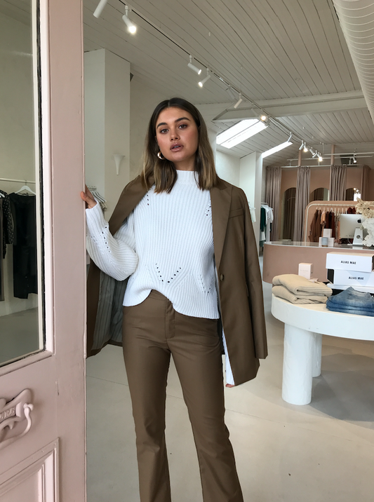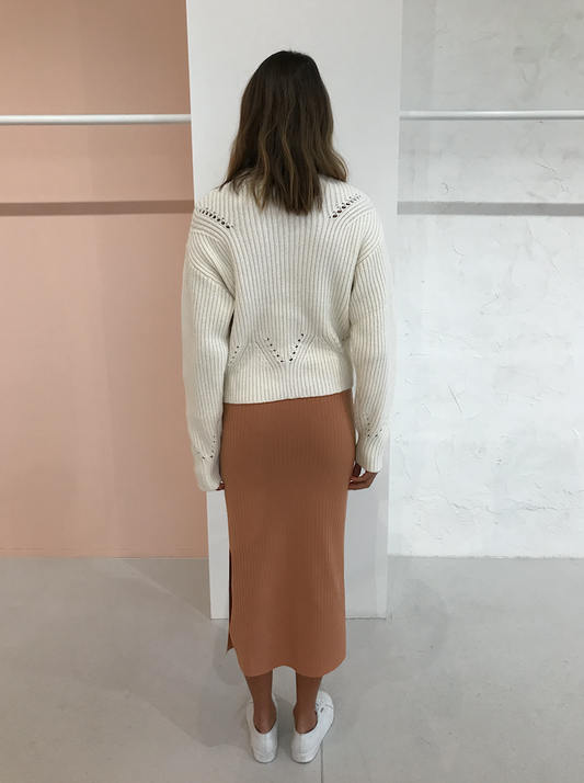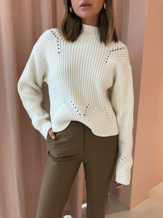 Knitted with a cotton wool blend, this slouchy ribbed sweater features oversized sleeves and a pointelle pattern across the neckline and hem.