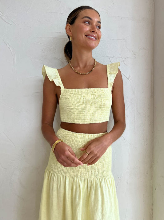 With the statement silhouette and fresh yellow hue, Coco girls are coveting this maxi skirt for all their resort occasion styling.