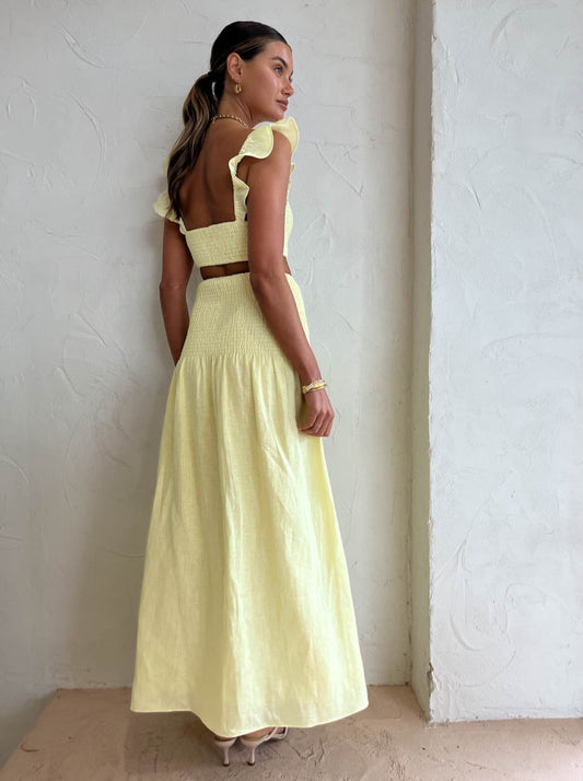 The Francesca Shirred Maxi Skirt in Butter from SIR. is a versatile sunshine silhouette for extra style mileage.