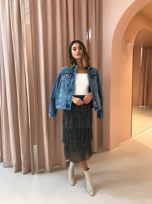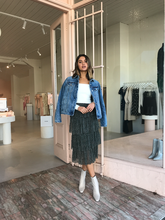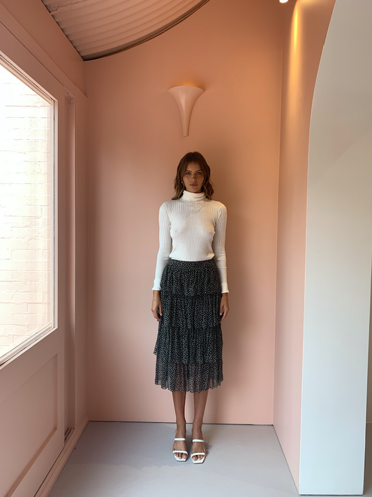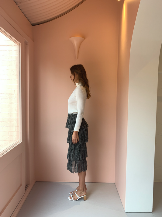 The SIR Isabella is a silk midi length skirt with gathered tiers. Skirt has waist band, invisible.
