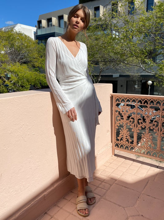 The SIR Vera Wrap Midi Dress in Ivory will be your favourite transeasonal dress in your wardrobe. Wear the included slip underneath or pair with your black bralette and boyshorts for more of a statement.
