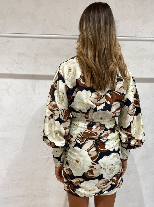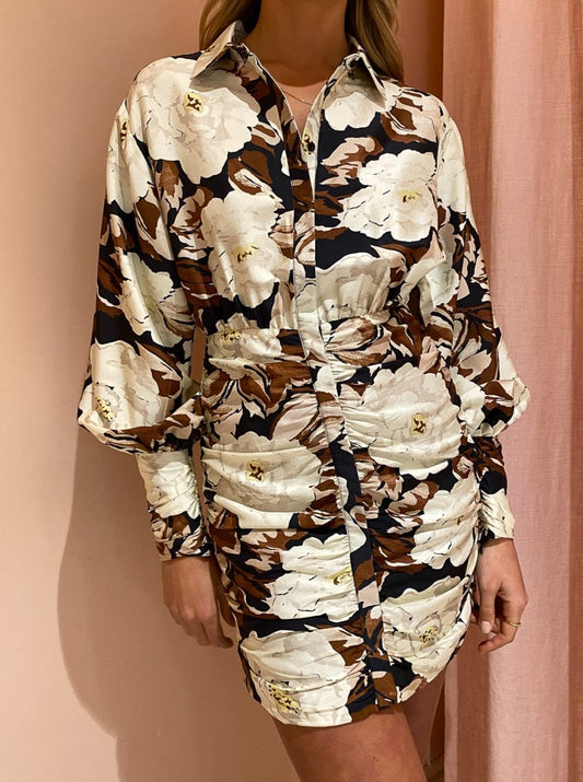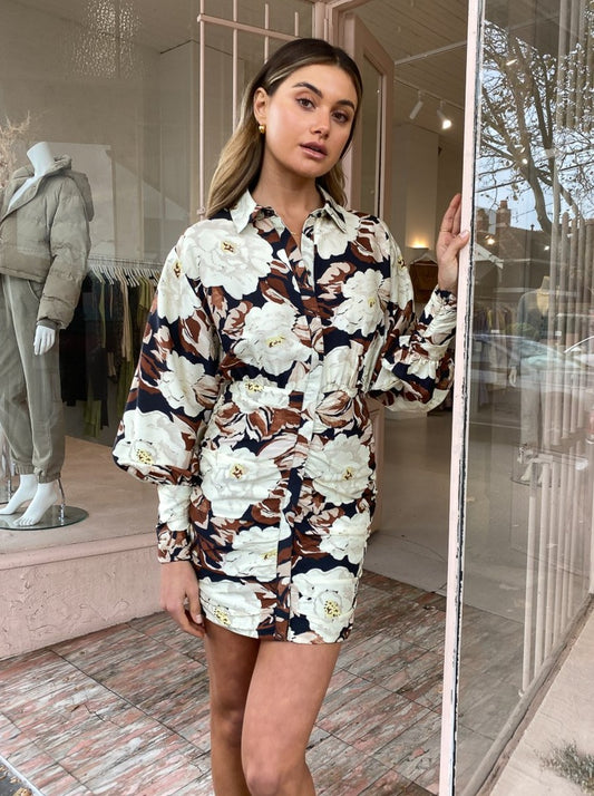 Cut from pure silk in the most charming floral print, the Vivienne Shirt Dress is fitted through the ruched skirt with a relaxed shirt bodice and statement balloon sleeve.