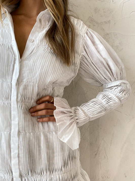 Inspired by renaissance couture, this romantic mini length shirt dress is delicate crafted from a lightweight and semi sheer Cotton Linen blend in a timeless Ivory hue. Fitted through the pintuck detailed body, it features a stand collar, button down front placket, complimenting pintuck detailed long sleeves and is fully lined for comfortable wear.