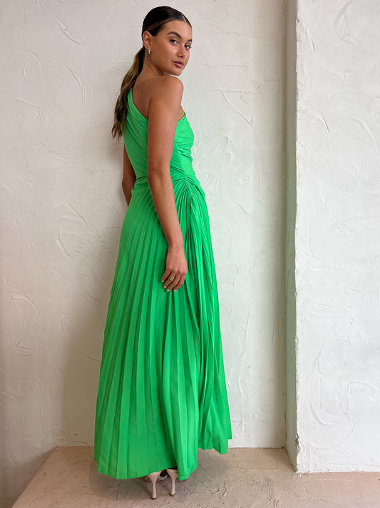 Crafted from a lightweight pleated fabrication, this one shoulder maxi dress features pleats cut on the bias and is artfully gathered on the hip to form and flatter.