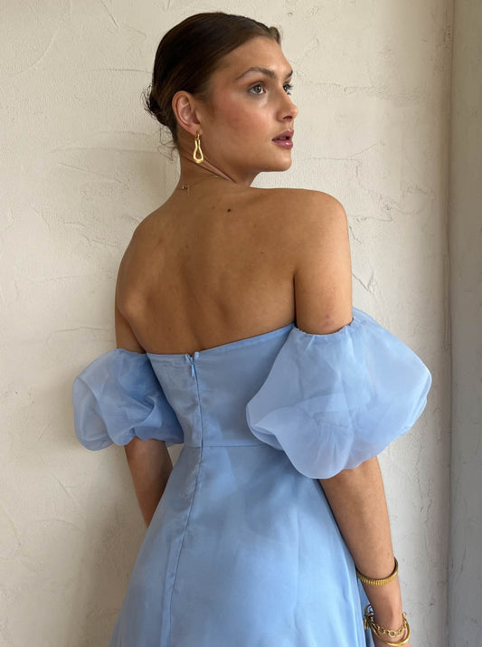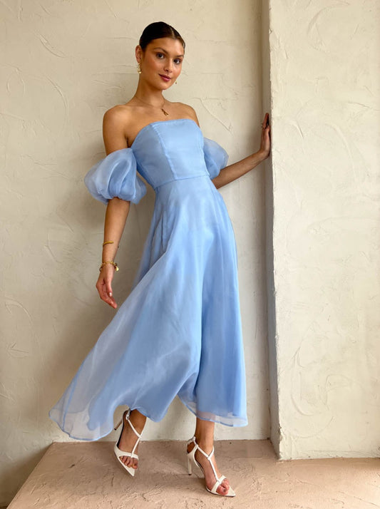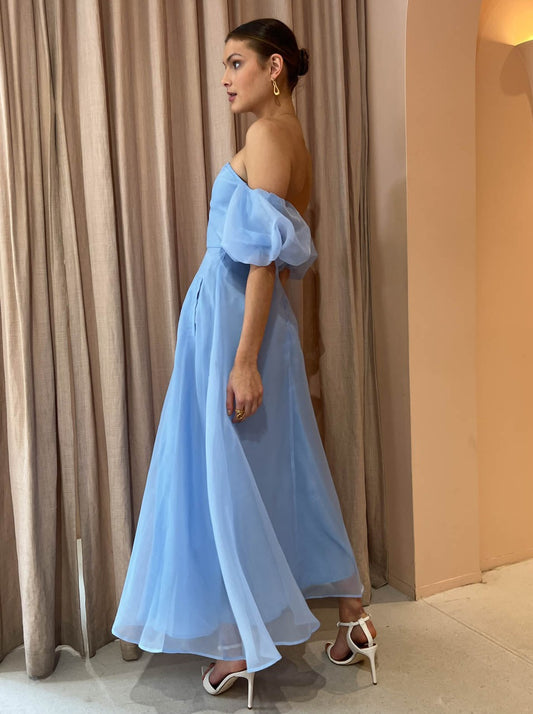 Cut from a semi sheer polyester organza, this fully lined strapless maxi dress features a fitted bodice, off-the-shoulder puff sleeves and a soft voluminous skirt.