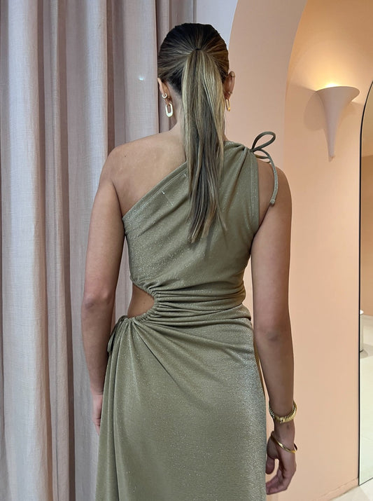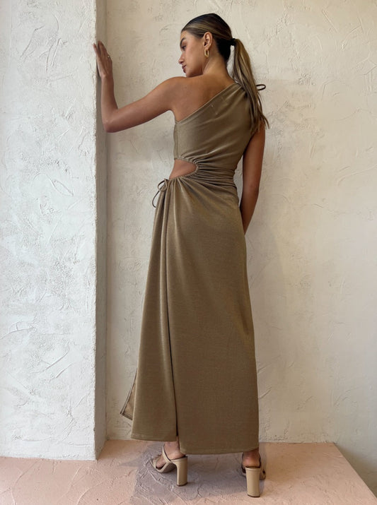 A signature favourite, the Nour Dress returns in a lurex Gold fabrication. Designed to flatter the femme form, this one shoulder maxi silhouette features an adjustable cutout at the waist with sculptural ruching and a high split for a figure skimming fit.