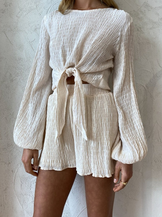 Elevating the shorts with its gathered textured fabrication, the Asher Shorts can be perfectly paired with the Asher Tie Blouse in Vanilla for those coffee dates, or styled over swim for those long sun-drenched beach days.